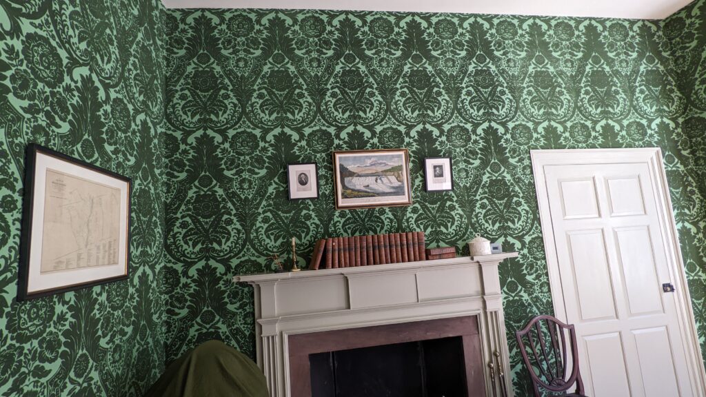 A paper or cloth with a decorative design printed on it and used to cover a wall. Photo from Schulyer House, Albany, New York, 2022. (Light, 1989)