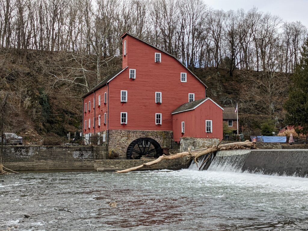 Any type of mill with machinery operated by water power; typically rotary power is supplied by a water wheel; related structures may include mill pond, mill race. (Bucher, 1996) Photo from Red Mill, Clinton, New Jersey, 2021.