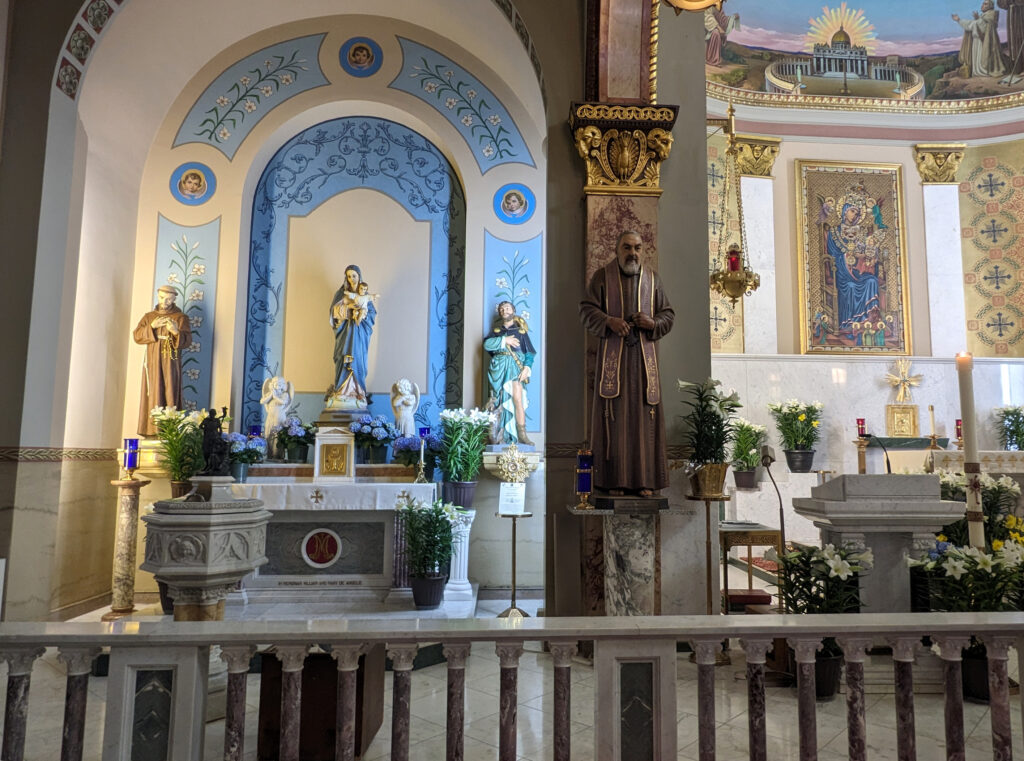 The sanctuary has beautiful sculptures and icons of the Madonna and Child and Padre Pio. Behind altar/" class="glossaryLink" data-cmtooltip="bb2a4f206858ede29aa7c14bfc686020" target="_blank" >the altar is anicon of Mary Queen of Heaven.