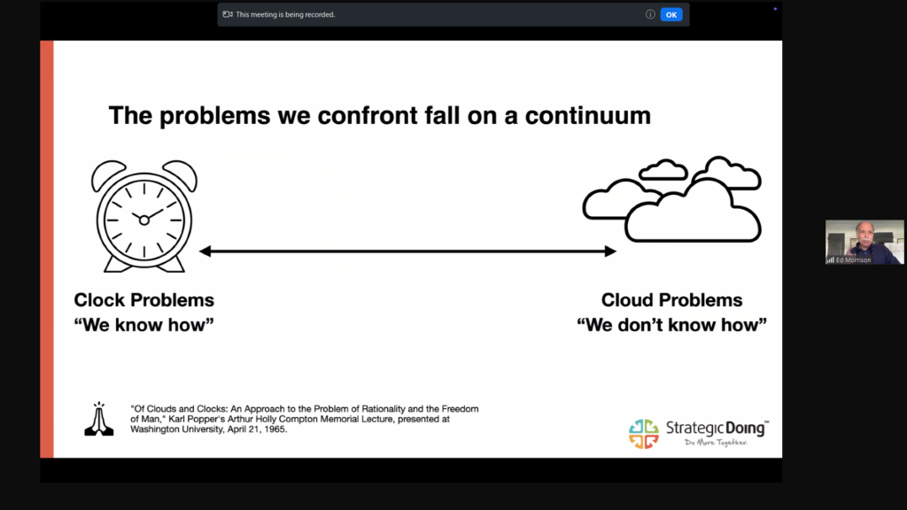 In a meeting, Ed discussed the difference between traditional management practices and adaptive management practices, emphasizing the importance of strategic doing. He introduces the concept of clock problems, which are well-defined problems with established solutions, and cloud problems, which are complex, evolving problems with no established solutions. Morrison emphasized the need for new skills, behaviors, and routines in adaptive management, including collaboration, trust, and continuous learning. He highlighted the role of conversations and storytelling in sharing knowledge and generating new ideas.