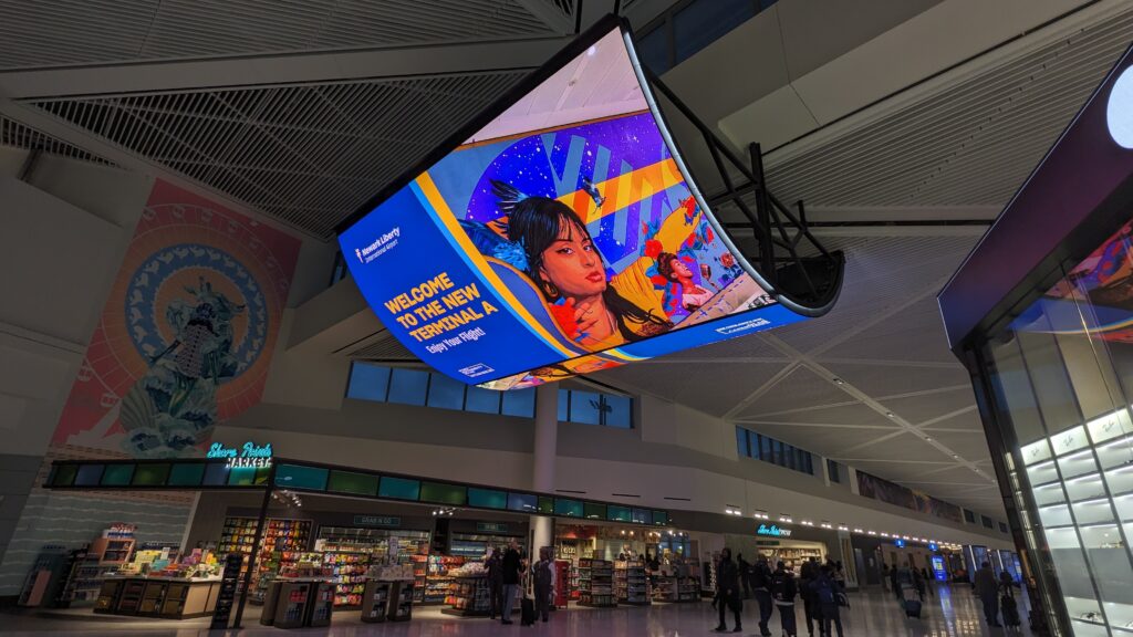 The large digital display boards were ceiling mounted with a curve/" class="glossaryLink" data-cmtooltip="4b844a8969d3a9ea07adb42af09501d6" target="_blank" >parabolic curve. This allowed a more immersive experience with the ads, some which were animated. The one with waves was particularly calming. Here I began to notice the public art in the terminal.