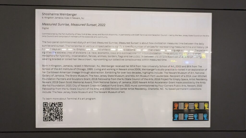 It started before checkin. A horizontal display rotated. I first saw New Jersey artists and then a True New Jerseyans display. Harriet Tubman was alongside Steve Forbes and many others. This mini education about New Jersey continued throughout the terminal. Calming music was pumped in accompanying the visuals.