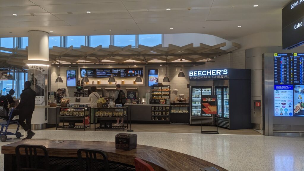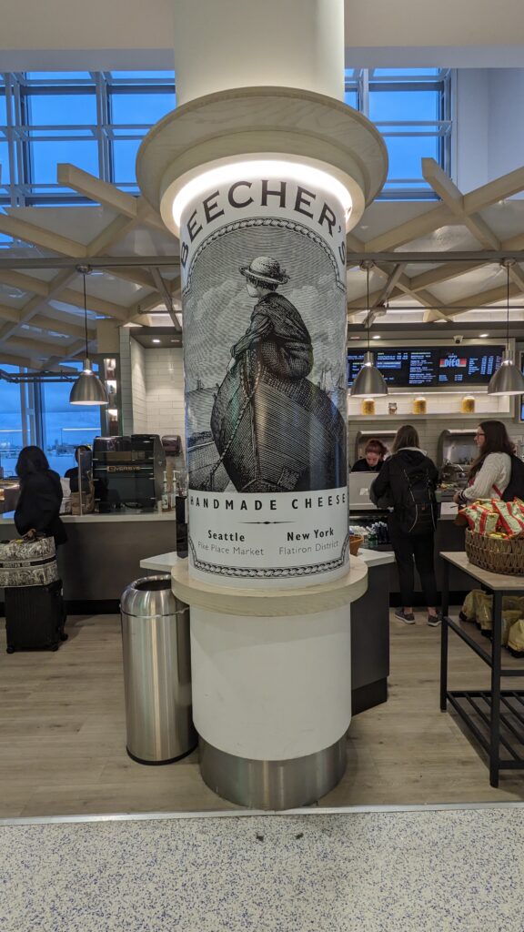 One bright spot was Beecher’s. This cheesemaker is famed for their New York and Seattle locations and handmade cheeses. Here at the airport they provided something different than other airport businesses. A croissant and small block of their Dulcet cheese made for a perfect breakfast bite and left plenty of extra to snack on later. I also grabbed a sandwich for my lunch. They had a three cheese sampler tray and also cheese sticks giving options for every price point. How natural for a business in different cities to have an airport location like this, as their supply lines pass through airports. Salt Lick in Austin has a similar presence.
