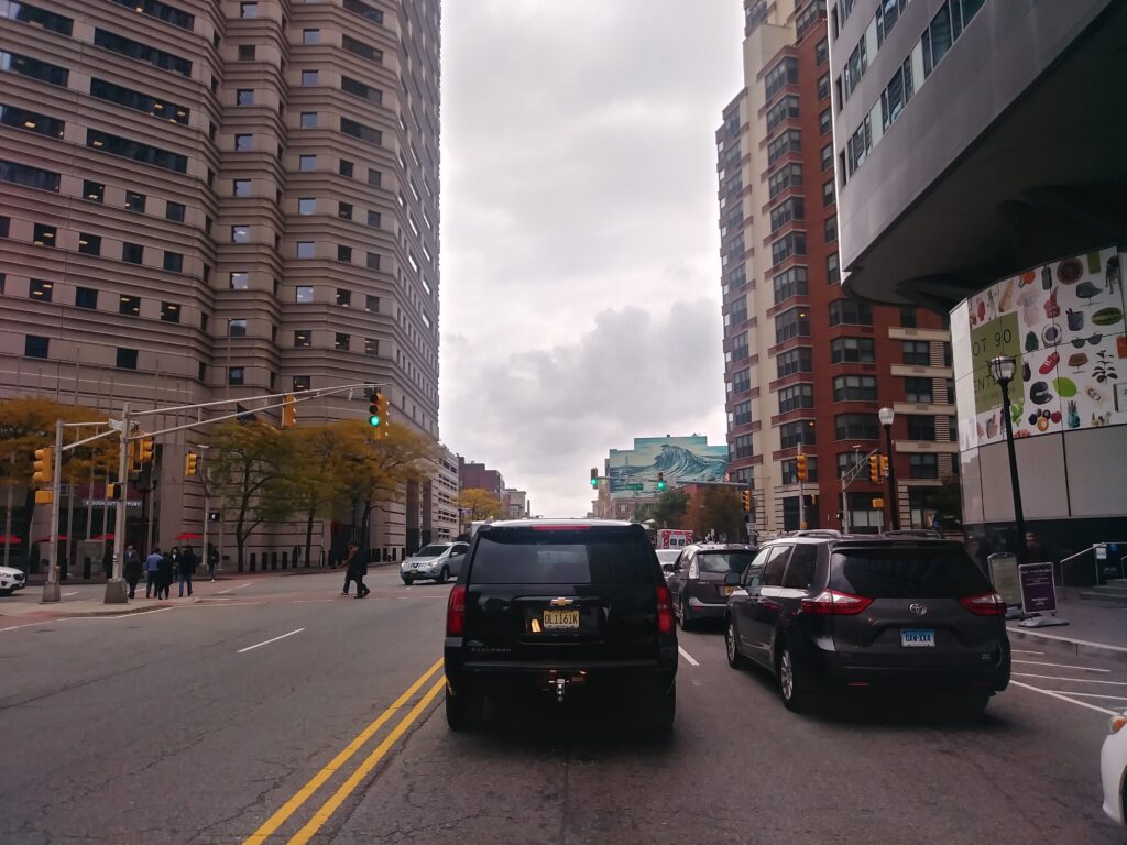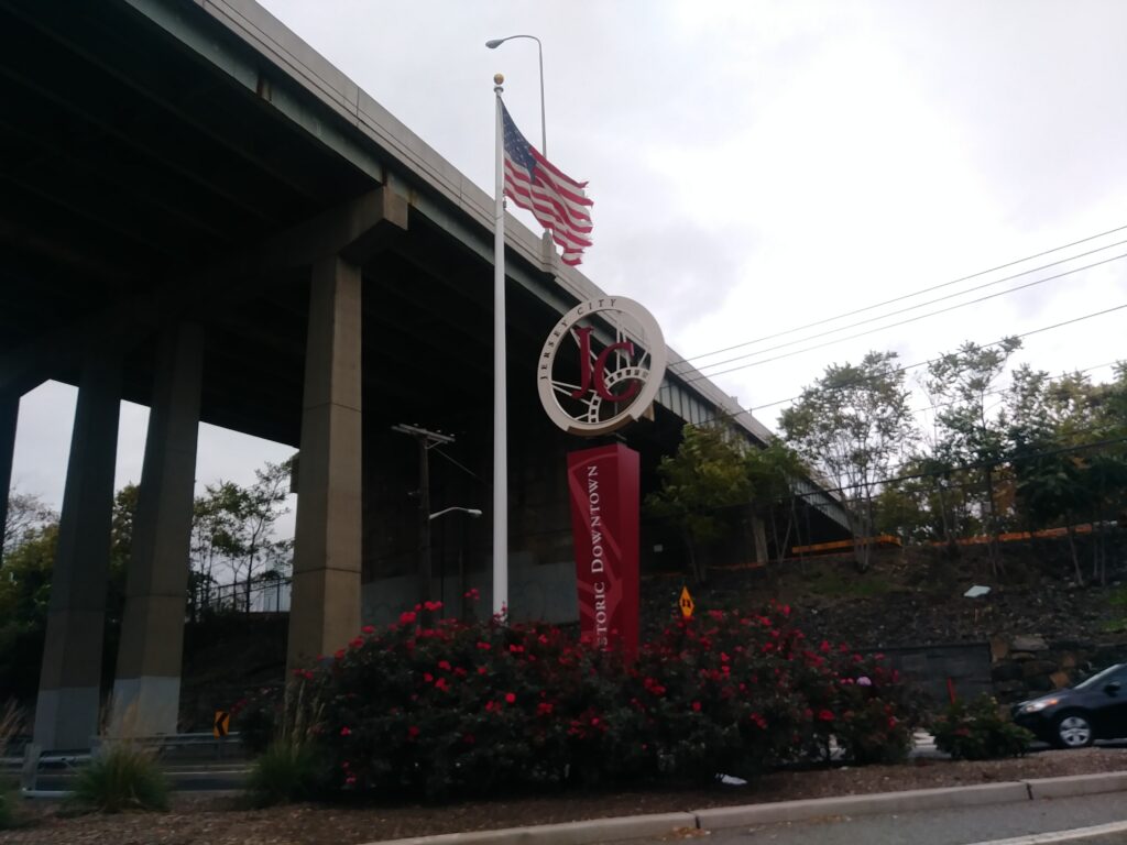 We only had a few minutes to look around Jersey City. At the entrance as we drove into the city, we were greeted by this pylon sculpture with “Historic Downtown” messaging supporting stylized iconography with JC in a letter and Jersey City written on the edge. Landscaping and a flagpole give this traffic island a dignified and cared for feel.