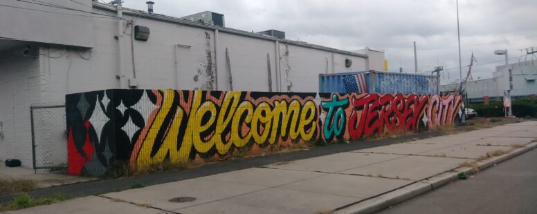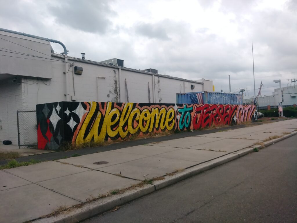 On our way out was saw this “Welcome to Jersey City” message on a patterned concrete brick wall. The colors are vibrant and the mural grabs the attention of people, even if for a second as they race by.