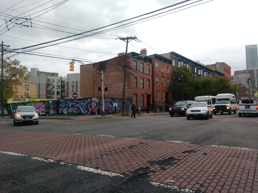 Jersey City has a fairly active mural program. Here a wall has a strong graffiti aesthetic and the messaging “Masters of Distortion.” In the foreground is a stamped asphalt crosswalk that has not held up well under the heavy traffic each day.